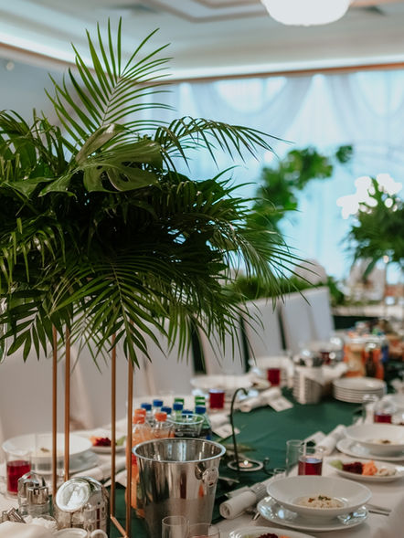 Na stołach gości ułożone są bujne kompozycje z zieleni, na wysokich stojakach.